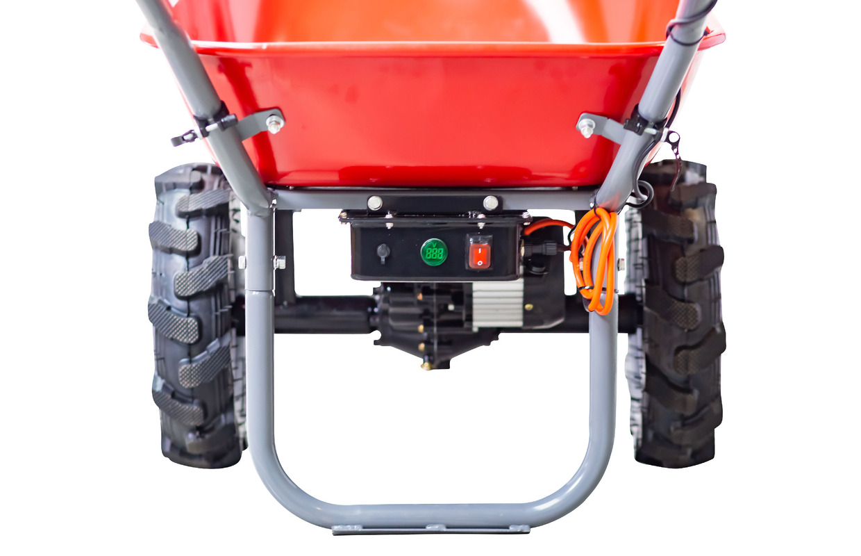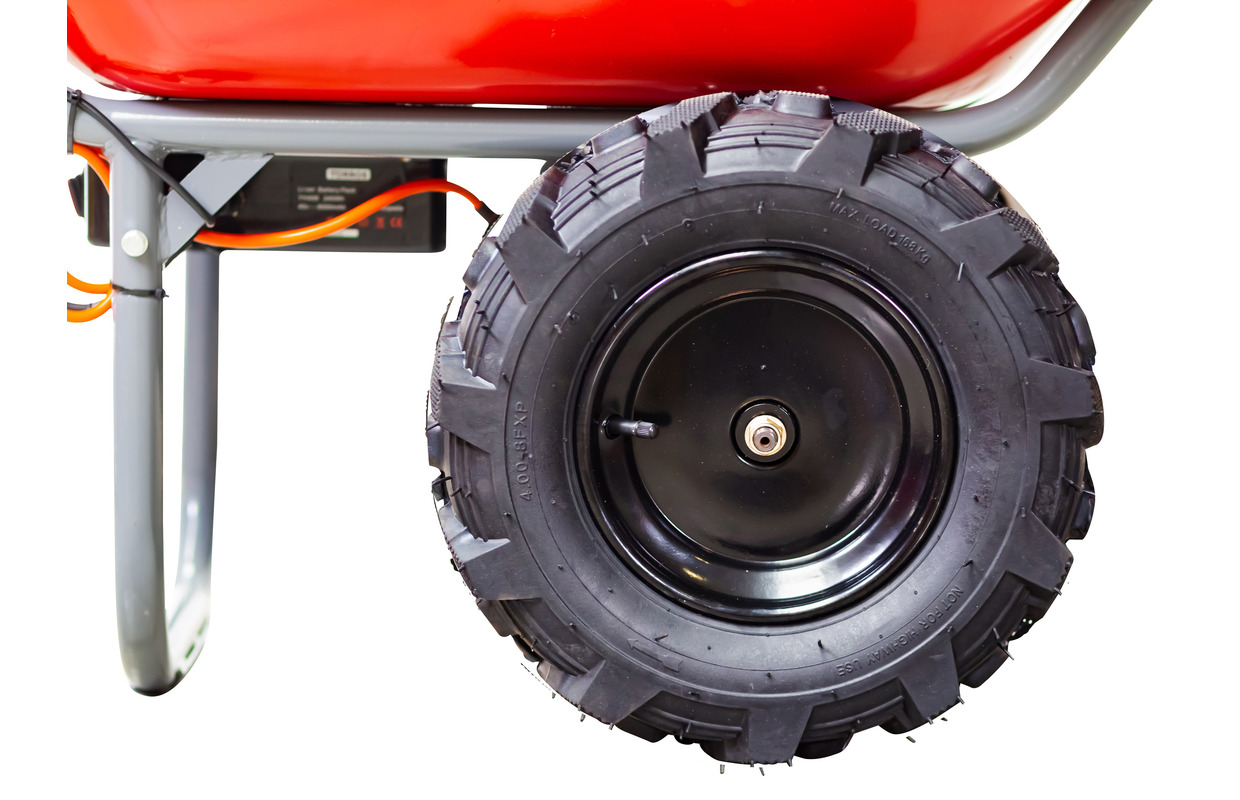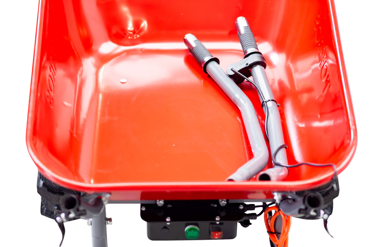 Brouette électrique avec roue avant double et bac métallique d’une capacité de 260 kg.