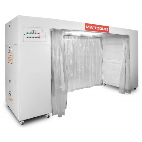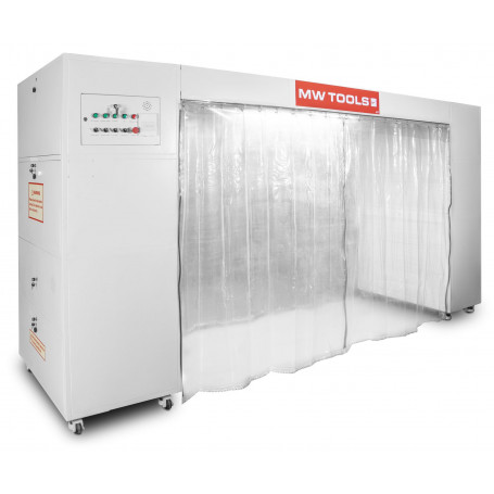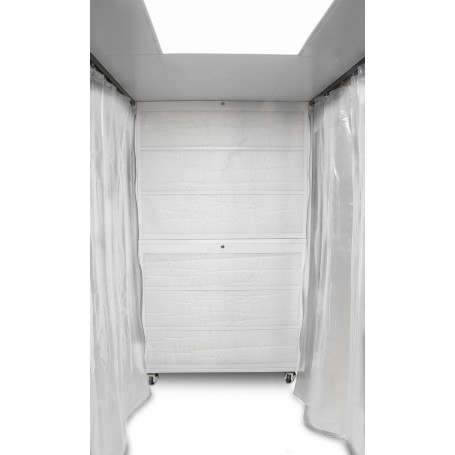 - 2 jeux de rideaux transparents en PVC sur les deux longs côtés qui permettent aux véhicules et autres pièces d’être entièrement ou partiellement à l’intérieur de la cabine et isolés de l’extérieur.