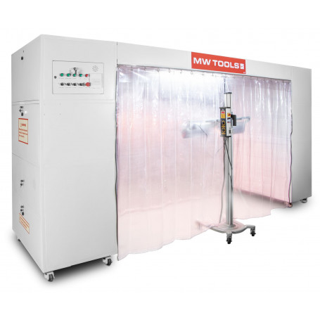 - Cabine mobile sur roues : elle peut être utilisée au milieu de l’atelier, près des véhicules, même là où il n’y a pas de possibilité d’extraction d’air.