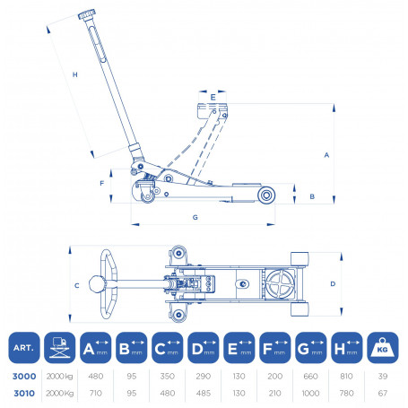 Cric de garage 2 tonnes avec profil bas, modèle long.