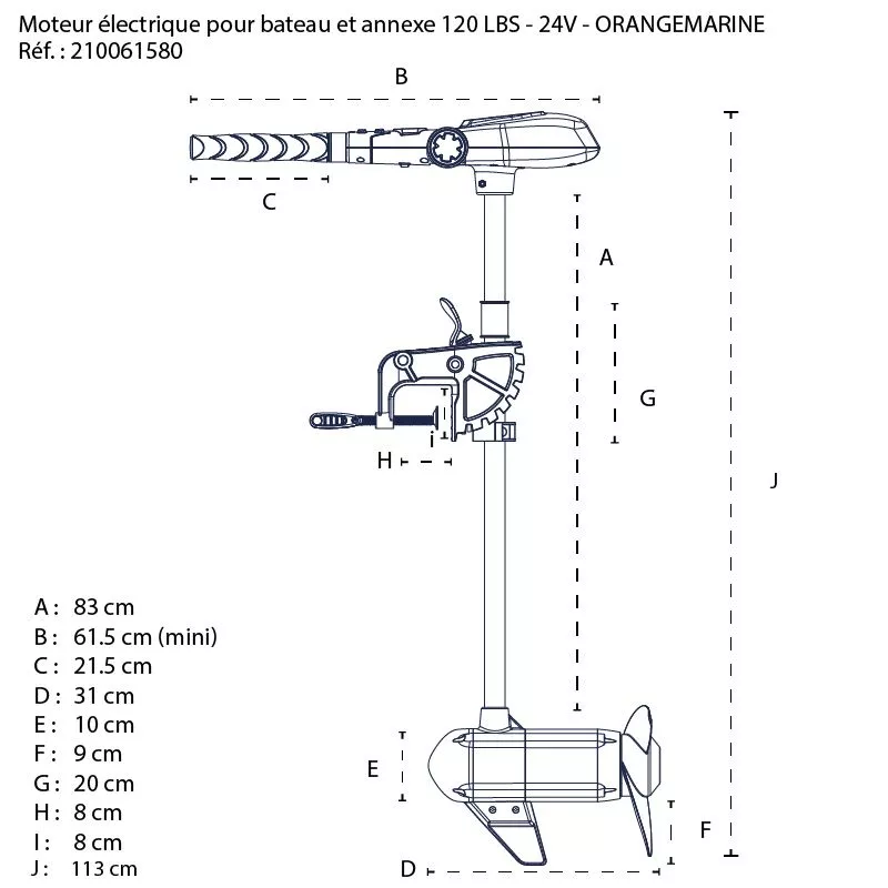 Le moteur électrique Brushless Orangemarine 120lbs est conçu pour une utilisation en mer et en eau douce, pour des bateaux jusqu’à 1100kg de charge. Il fonctionne sur une alimentation de 24 volts.