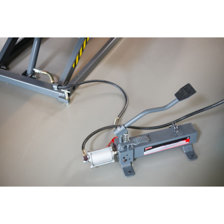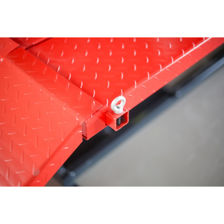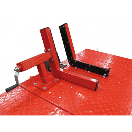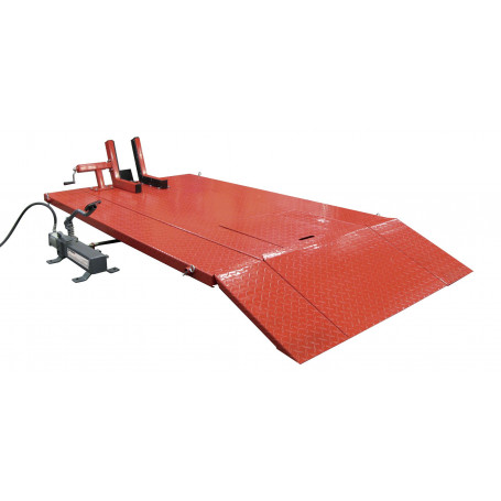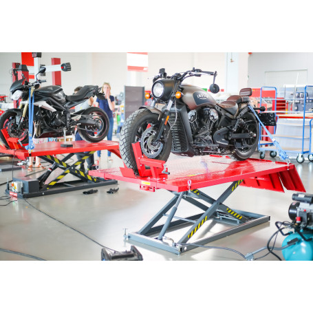 Il est équipé d’une rampe et d’un étau de maintien pour travailler au niveau de la roue avant de la moto. Il possède également une plaque amovible permettant de travailler la roue arrière et qui s’abaisse pour faire monter la moto sur le pont.