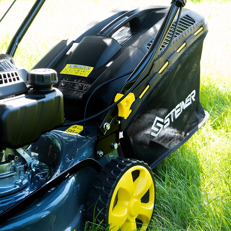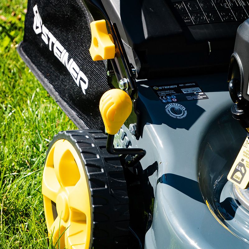 Régler la hauteur de coupe est important, notamment lorsque l’herbe est haute. Il vous sera alors conseillé de réaliser deux tontes : la première avec une hauteur de coupe haute, et la seconde avec une hauteur plus basse. Le réglage centralisé de la tondeuse thermique permet de régler les 4 roues en même temps, en un coup de levier. C’est le système le plus pratique et le plus conseillé.